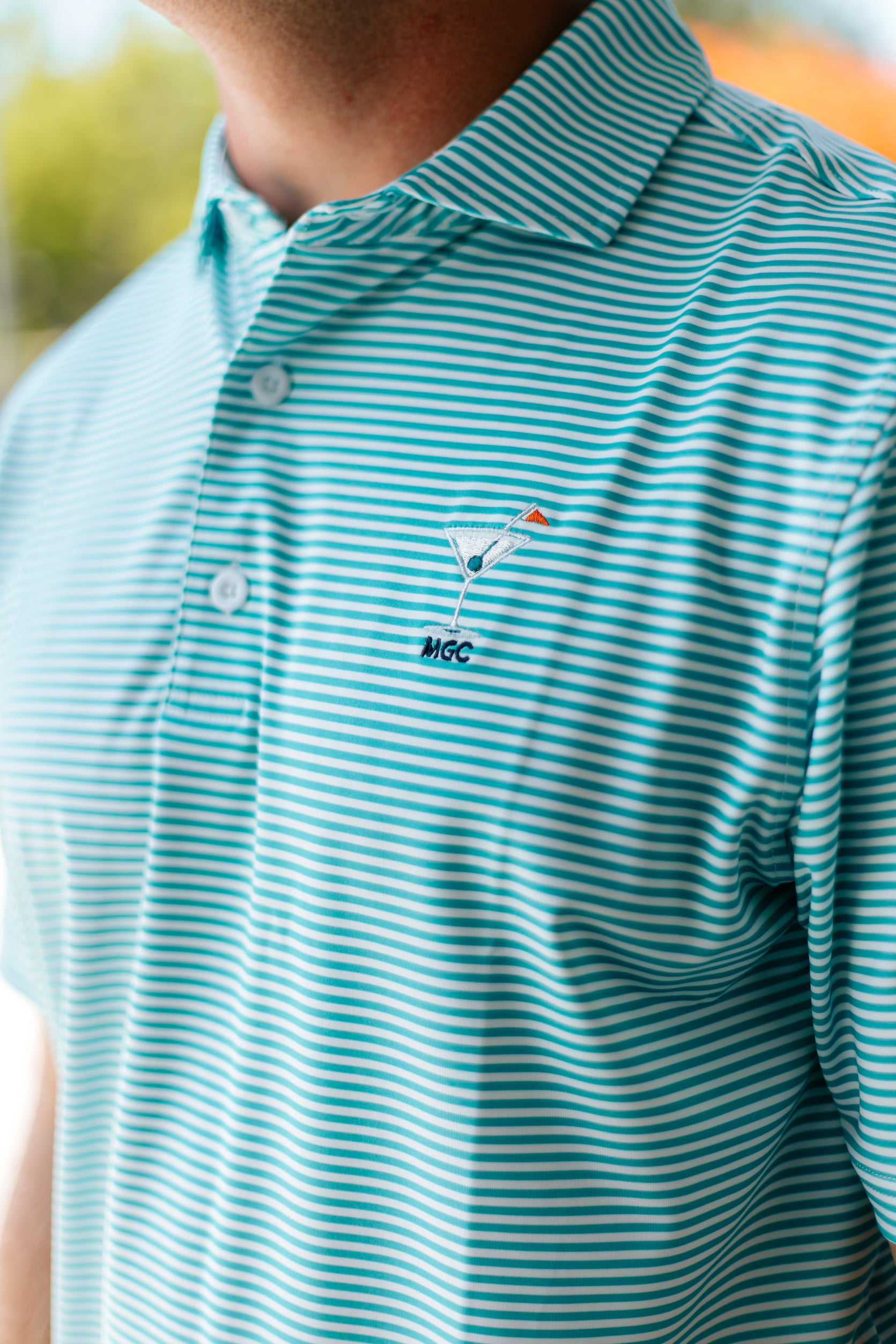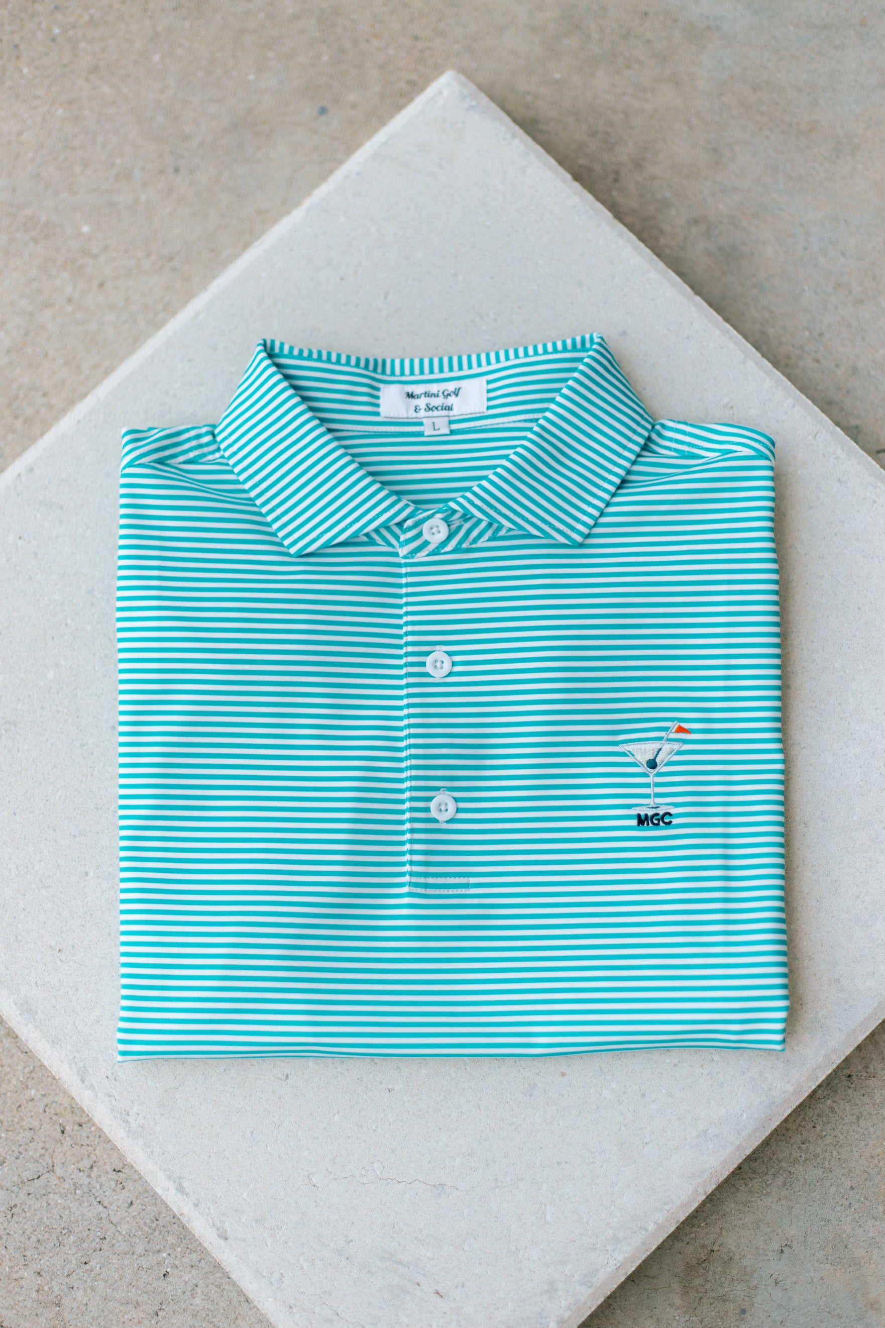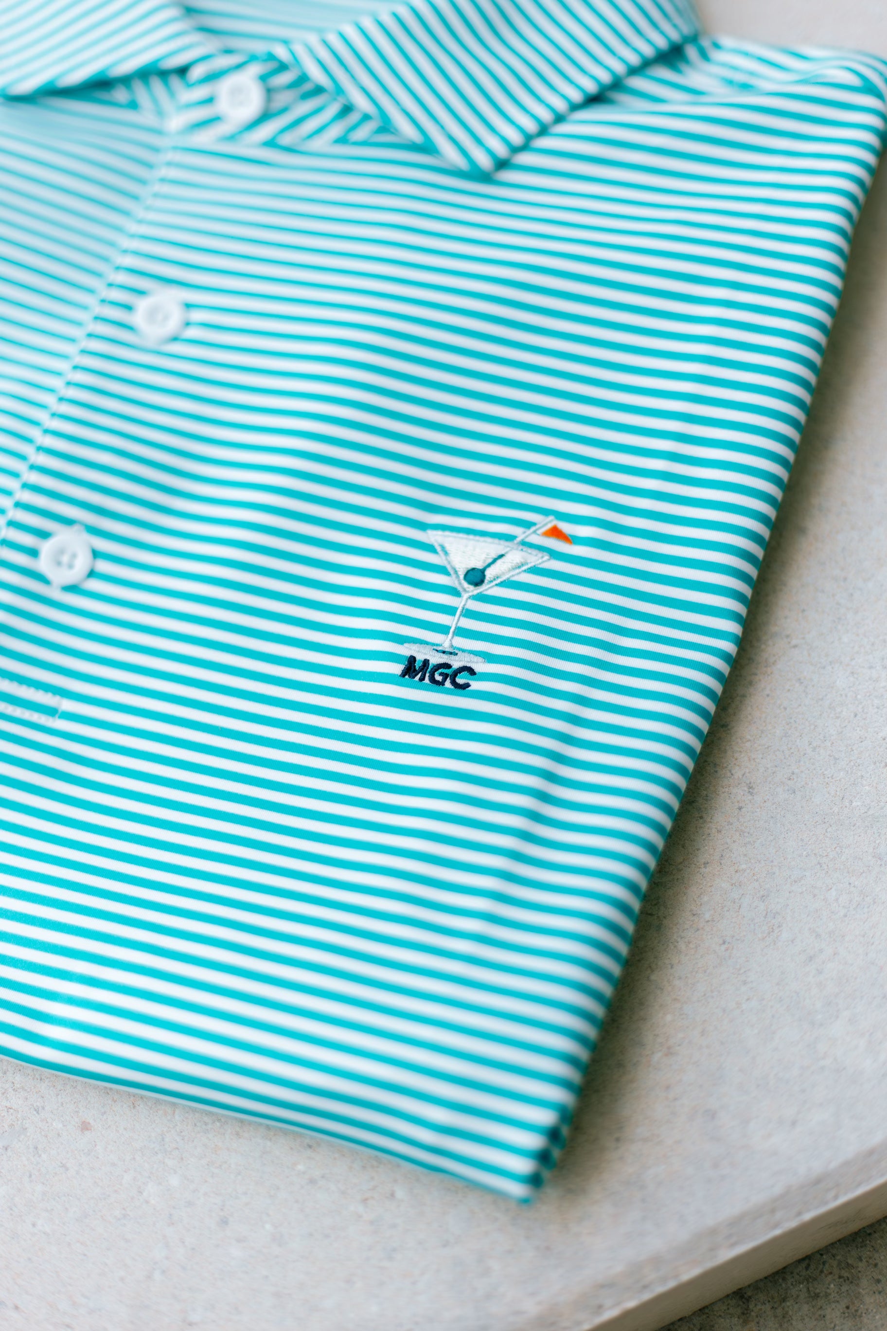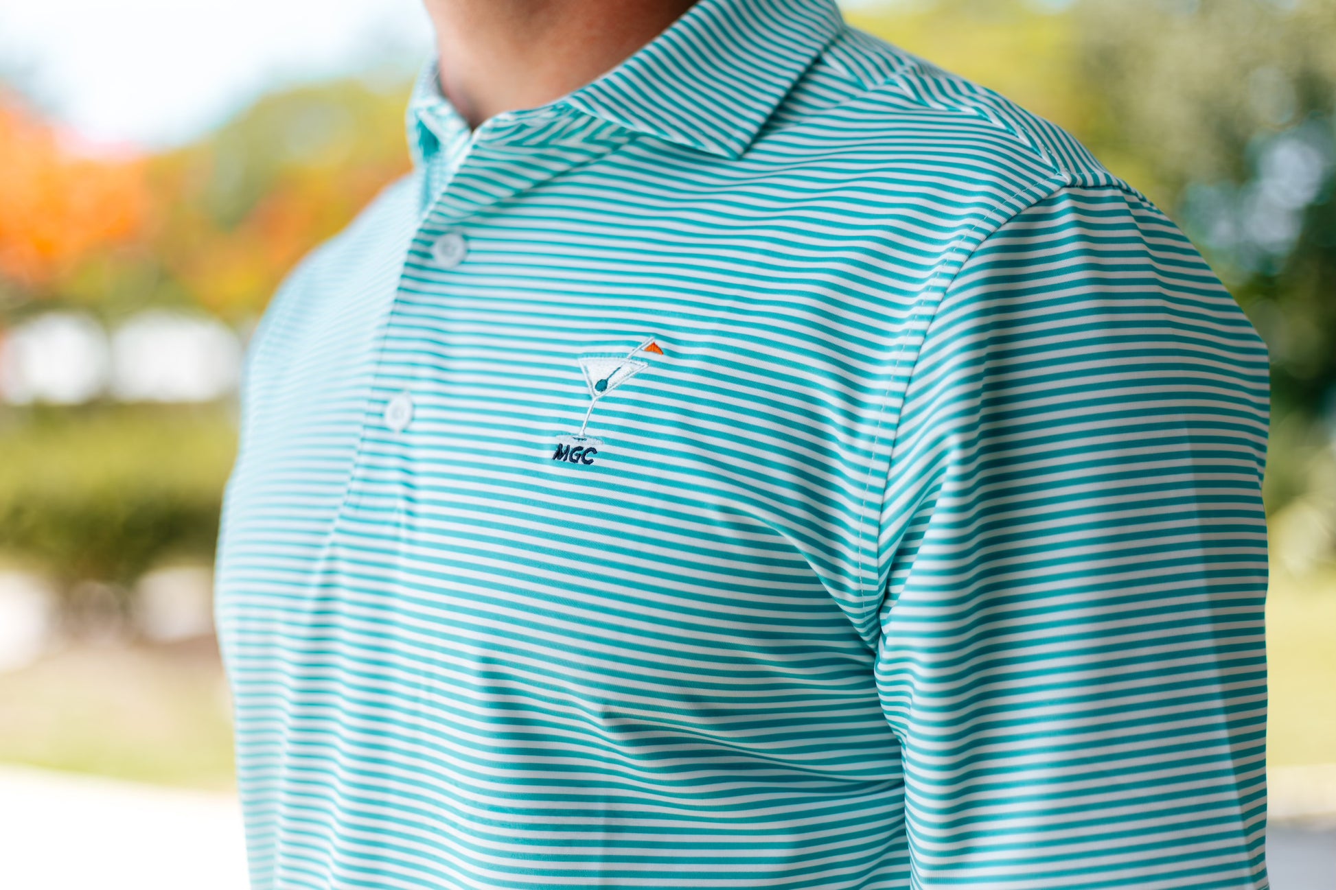 Elevate your game with the Island Green polo from Martini Golf Club—a refreshing blend of laid-back style and elevated performance. Featuring crisp horizontal stripes in seafoam green and white, this polo captures the essence of coastal fairways and post-round cocktails. Lightweight, breathable, and effortlessly cool, the Island Green is your go-to for sunny rounds, beachside socials, and everything in between.